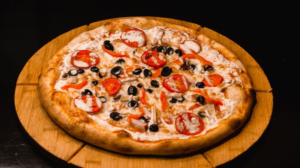 Тесто, бекон свиной, маслины, грибы, перец болгарский, соус